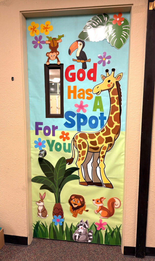 The church kindergarten room is newly decorated and here is a photo of the entrance. I like the message that God has a spot for you!