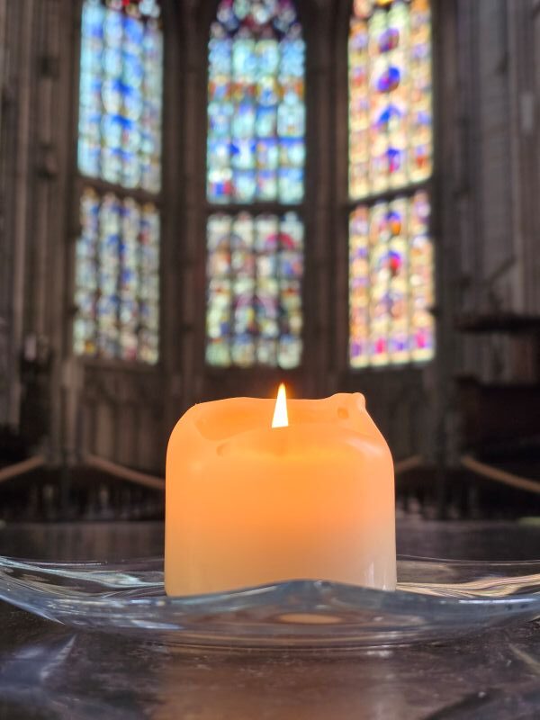 As you walk through a small doorway and make your way to the sanctuary, the ceiling jets upwards. In front you see beautiful stained-glass windows, over 40 feet high. The designs, the light, the color, all quite remarkable. In the image I have included a single burning candle was set on the table, with the stained glass as a backdrop.