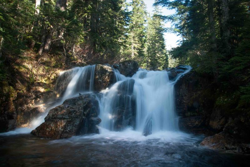 I have photographed the “Falls on Commonwealth Creek” numerous times. On each occasion the falls presents a different face. In the spring when the snows are melting the flow can be enormous, to the point that the supporting rocks are completely engulfed. In the cold of winter, I have witnessed the falls completely frozen with no flow visible. In the driest part of summer, the stream may barely dribble down the rocks. Different views, but the same place.