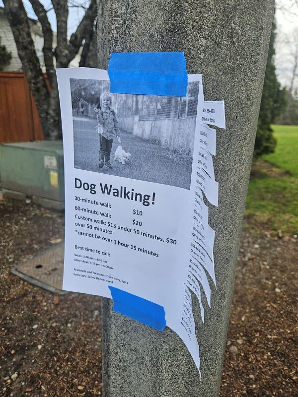 I don’t know how successful this dog-walking team will be, but they’ve started strong (and probably with parental support), and seem ready for business. They’ll learn a lot as they go, and what they learn will help them in other endeavors in the future.