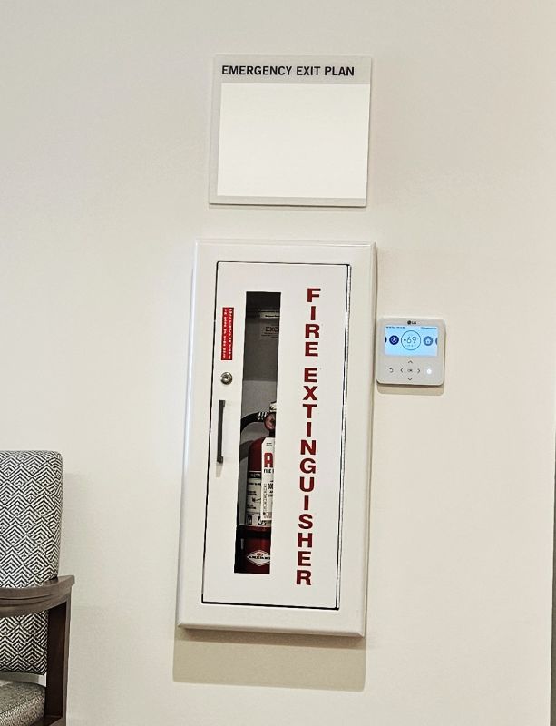 As you can see, a robust fire extinguisher peaks out through the window in the door on the wall. Any flame in the vicinity would scarcely stand a chance against this protection.