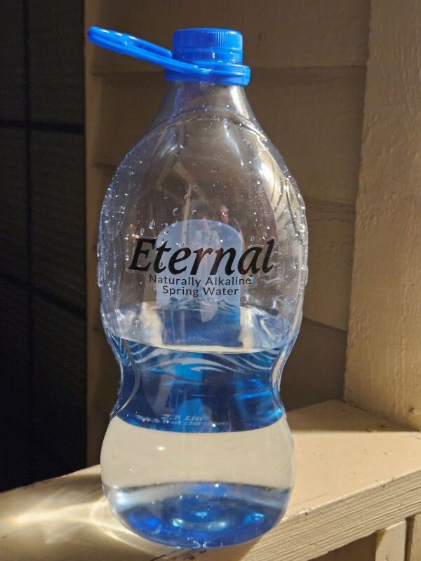 Shelves of beverages beckoned me – all manner of energy drinks and juices and kombucha and fancy flavors. I stubbornly searched the aisles for just plain ol’ water. Finally I saw, stacked near the front of the store, what you see in my photo – a big 2.5 liter jug of water.