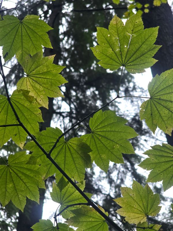 During a recent stroll through the nearby woods, I caught a glimpse of these maple leaves, (growing on a Vine Maple tree). As you can see, the sunlight is penetrating the thin green leaves, almost highlighting them against the darker foliage of the evergreen boughs.