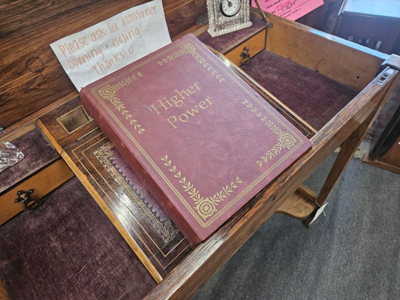 Not long ago Shelley and I wandered through a favorite antique shop. Near the counter was this impressive wooden case labeled “Higher Power.” I reached out and opened the case.