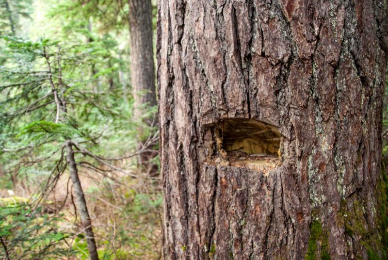 One might think that the damage in today’s photo was caused by careless disregard of the forest. But it is not what it seems. The platform that was chopped into the trunk of this tree is just one example of more that fifteen trees with similar holes that I have found in the Commonwealth Basin near Snoqualmie Pass. It is a remnant of commercial fur trapping that took place until the early 1950’s. The trapper used the platform to place bait and a trap in hopes of catching a fur bearing animal. Typical targets in this area included: fishers, pine martens, weasels, ermines and other similar animals. Now within the boundaries of the Alpine Lakes Wilderness, all commercial activity is prohibited. As the trees age, the old “Trapper Trees” are disappearing.
