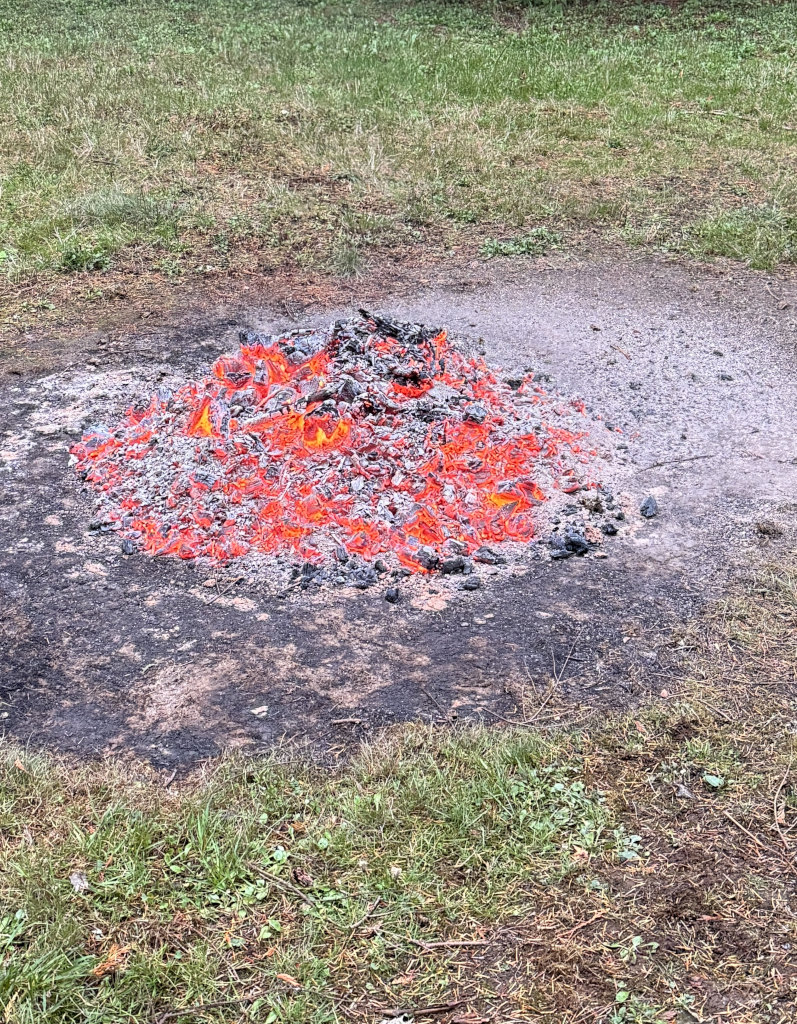 We took advantage of rainy weather to get a brush pile burned and I grabbed a photo of the final coals. It is hard to judge the size of this pile but is maybe four feet wide. It was still too hot to stand close enough to roast marshmallows.