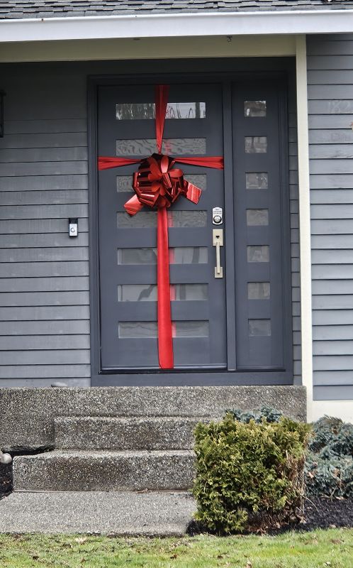 Some sights just bring an immediate smile, even if I don’t know what’s going on. Such was the case when we walked through a familiar neighborhood cul-de-sac last week and suddenly saw this front door, gift-wrapped in glossy red ribbon.