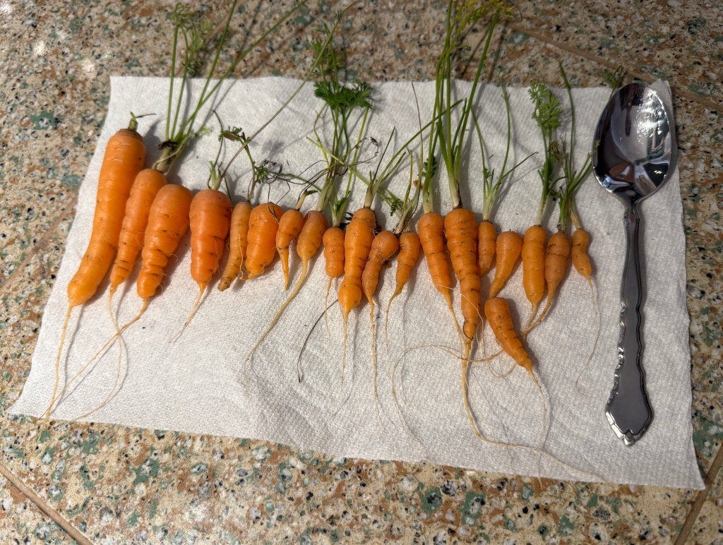 This last summer I tried planting finger sized carrots along with basil and cilantro. But things turned out differently. I was traveling and only tended the tiny garden occasionally. The basil and cilantro just stopped growing after reaching about six inches tall. The carrot tops popped out but then seemed to shrink back down. I finally remembered to harvest the carrots recently and the picture shows the entire crop.