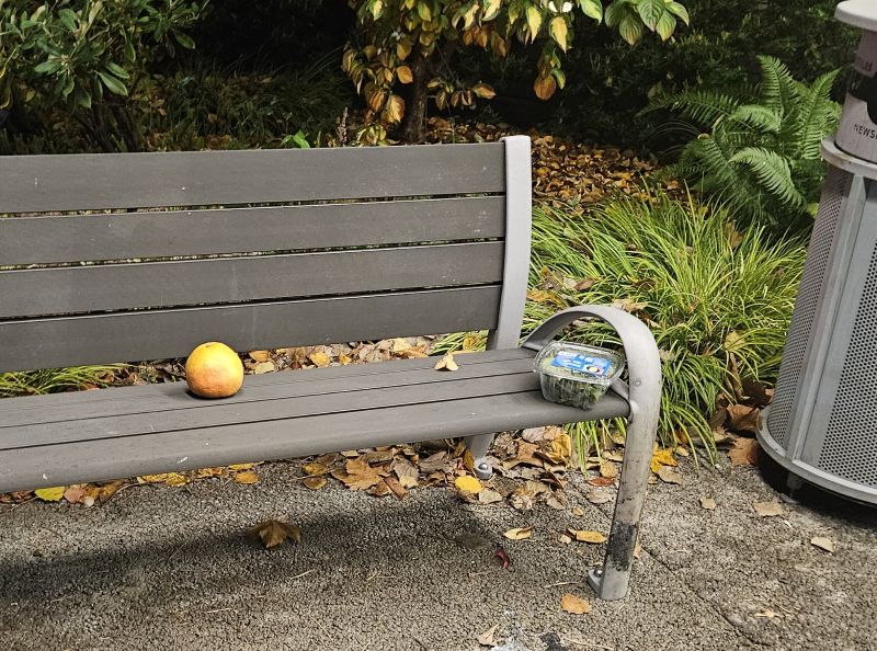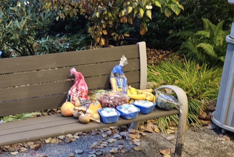 Thursday afternoon of this week, I arrived at our local library a bit after 4 p.m. to see these food items parked on a bench outside the library door. (Sorry for the badly-focused photo.) As you can see, there’s no accompanying sign, just the food. But it’s obvious that a generous soul parted with some personal funds to provide help.