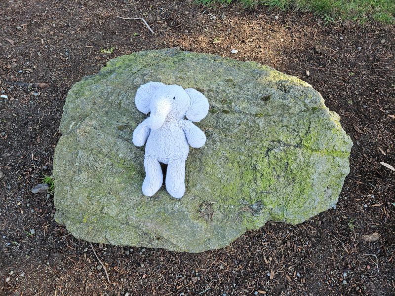 This long ago memory resurfaced when we saw this stuffed elephant on our morning walk. It looked like he’d been carefully placed on this large rock, one of many that rim our neighborhood park, so that whoever lost him could find him.