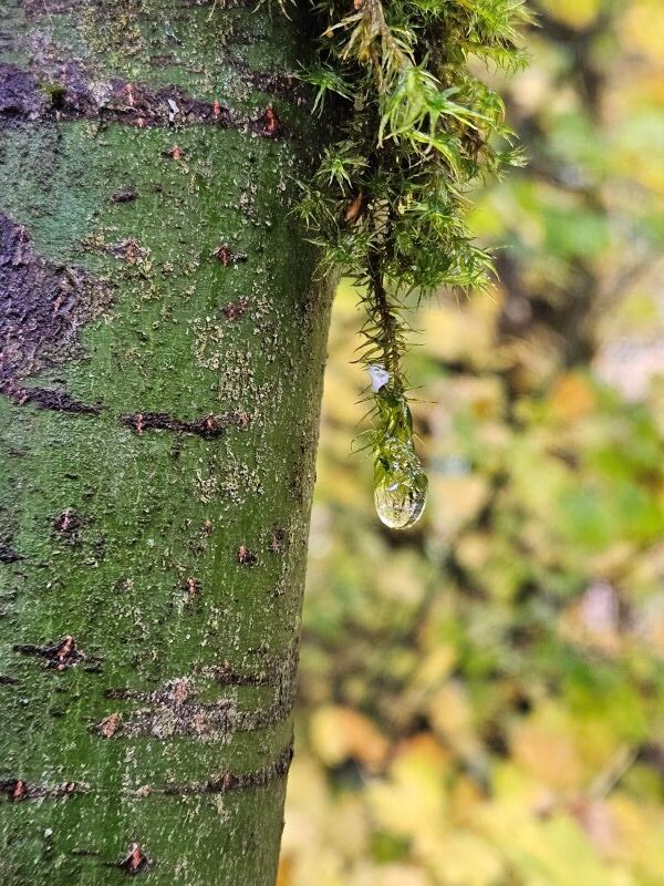 This “tree tear” stopped me in my tracks this week. It has been a wet and windy week, and as we walked through a narrow part of our neighborhood trail, I suddenly saw this waterdrop suspended in space close beside us.