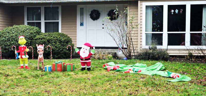 Though neither Shelley nor I are ones to go all-out with exterior Christmas decorations, our style being more of a modest door-wreath and a small lighted Christmas tree in an upper window, we hugely enjoy the displays of the neighbors in our development. In fact, Shelley is able to keep in mind which neighbor puts up which décor each year, which leads to such exclamations as, “I don’t see the dancing hula-skirt Santa yet,” or “That family’s doing Seahawks-colored lights this year.”