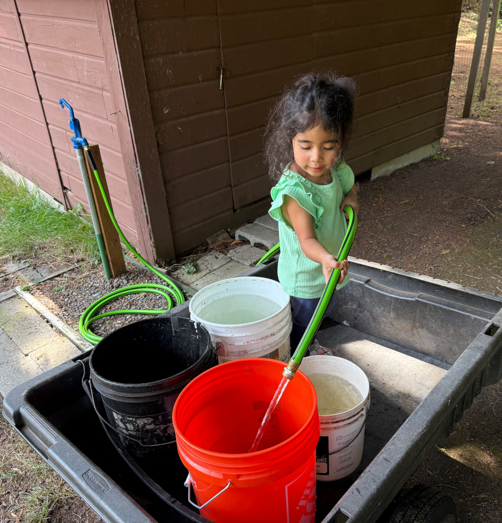 Here she is in the photo filling water buckets in a wagon pulled by a lawn tractor. Once at the tree, she was delighted to use the little bucket to do the watering. She had me keep adding water to it from the big buckets.