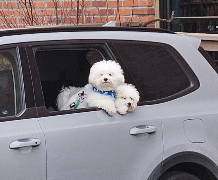 This past Tuesday, on our way out of a Redmond bookstore, Shelley and I noticed this utterly sweet scene – two dogs (maybe siblings?) waiting patiently at an open car window while their owner shopped inside.