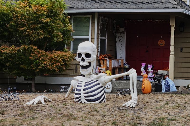 As October crawls along, Halloween decorations are beginning to sprout on our neighborhood properties. This giant half-buried skeleton is making its second-year-in-a-row appearance on this lawn, along with a number of face-carved pumpkins and a few scattered small fence segments containing skull carvings.